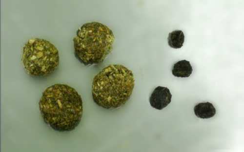 På billedet ser man afføringen fra kaniner i forsøget. Lorten til vestre kommer naturligvis fra en kanin, som spiste en mager og fiberrig diæt, imens afførings kuglerne til højre, blev produceret af kaniner som spiste blandings mad.