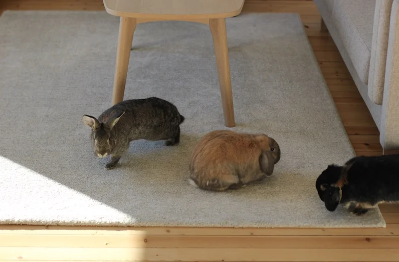 Kaninene bør ha sklisikre tepper til å løpe og herje på, så tepper kommer man heller ikke unna. Det er da viktig å finne noen som er lette å rengjøre. Jeg er kjempefornøyd med Rival Frise som vist på bildet. Om man får flekker på teppet er det også enkelt å få bort. Teppet er mykt og godt for både menneske- og kaninlabber.