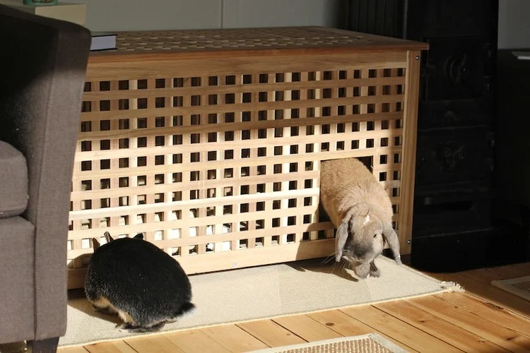 For å sørge for en lett og effektiv rengjøring bør man også ha møbler og utstyr i orden. Det er naturligvis lettere å forhindre støv om man har skap med dører og ikke åpne bokhyller på en hel vegg. Det er lettere å holde det rent om man har det ryddig og også har overflater som er enkle å tørke over. I tillegg bør man ha et kaninhus hvor man både har dokasse og høyhekk. Da kan man minimere støv som virvler opp i lufta. Vi har høy og dokasse i et tilpasset bord fra Ikea. Hol har blitt til kaninHol. Lag to innganger for et praktisk kaninhus.