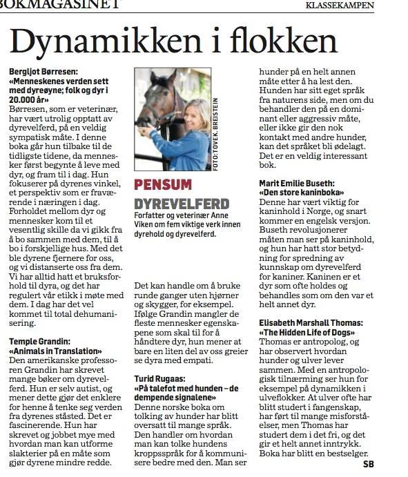 Forfatter og veterinær Anne Viken skrev om fem viktige bøker innen dyrehold og dyrevelferd i Klassekampens faste bokmagasin. Jeg ble stolt og glad over å se at Den store kaninboka var med.