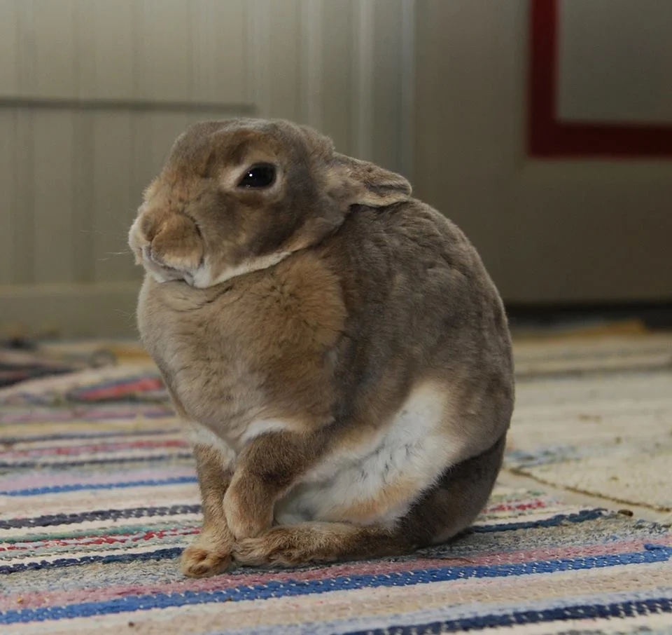 Dinka viser tegn på smerte. Katarina hadde kanskje ikke sett det om det ikke hadde vært for at kaninen vanligvis løp omkring og ville ha mat da hun stod opp. Dinka ville ikke sosialisere eller spise, men satt som en ball og trykket. Det viste seg også at Dinka var alvorlig syk. Se hvordan det går med henne senere i innlegget. Foto. Katarina Vallbo