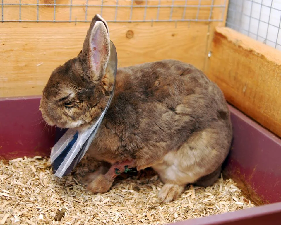 Det viste seg at Dinka hadde abscesser på den ene forlabben. De ble fjernet kirurgisk, men kaninen fikk dessverre skader på det ene øyet under operasjonen. Det var en periode hun ikke hadde det så greit, men hun fikk både omsorg, godt stell og tilstrekkelig med smertelindring. I dag er hun en glad og frisk kanin. Foto: Katarina Vallbo, Sverige