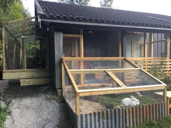 Blitz og Eddie har et hus med en isolert og oppvarmet del, samt tilgang på to rovdyrsikre løpegårder. De har isolerte og lune kasser å hvile i, samt god plass å bevege seg på. Familien har tenkt på at kaninhuset skal være lettstelt og bra for kaninene, både sommer og vinter.